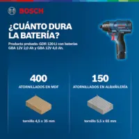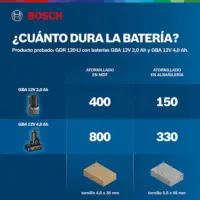 La luz LED integrada ilumina áreas oscuras, y su mandril hexagonal de 1/4″ ofrece compatibilidad con accesorios estándar. Además, es 100% compatible con baterías y cargadores Bosch 12V (no incluidos), asegurando flexibilidad en tu taller o obra.