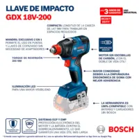 La Llave de Impacto Inalámbrica Bosch GDX 18V-200 redefine el poder y la eficiencia con su motor Brushless y un torque máximo de 200 Nm. Perfecta para montajes industriales, estructuras metálicas y talleres automotrices, esta herramienta ofrece el doble de vida útil sin mantenimiento.