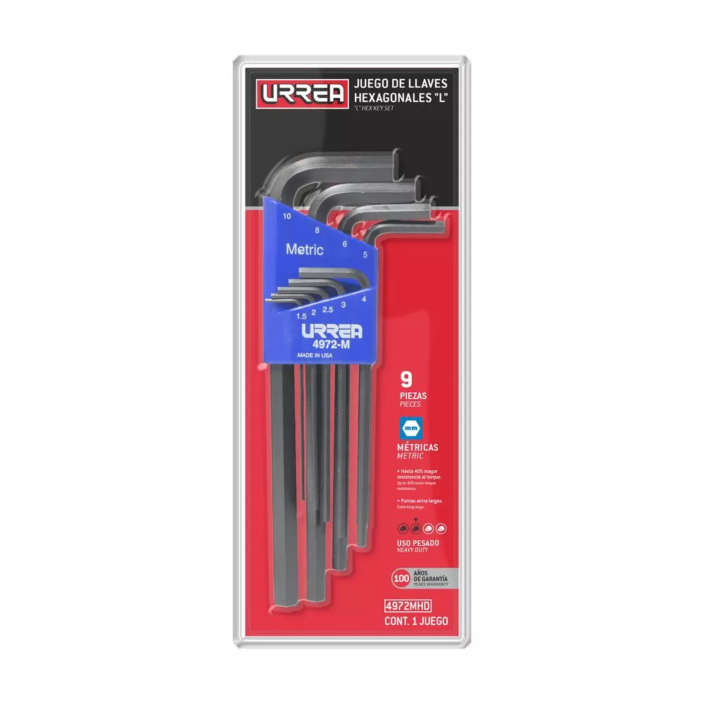 Set industrial de llaves hexagonales reforzadas para aplicaciones de alto torque. Fabricadas en acero al cromo-molibdeno con garantía de 100 años.
