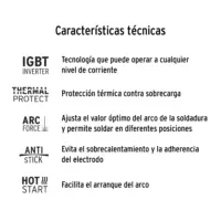 – Ligera, compacta y fácil de transportar – Mayor eficiencia y menor consumo eléctrico que una soldadora convencional – Para proceso de soldadura de electrodo revestido (SMAW-MMA) – Bornes de cambio rápido |