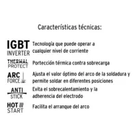 | Características adicionales | – Ligera, compacta y fácil de trasportar – Mayor eficiencia y menor consumo eléctrico que una soldadora convencional – Para proceso de soldadura de electrodo revestido (SMAW – MMA) – Bornes de cambio rápido |