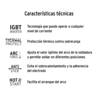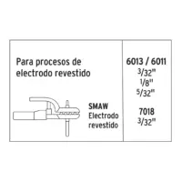 • Proceso de soldadura por electrodo revestido (SMAW-MMA), compatible con electrodos tipo 6013, 6011 y 7018.