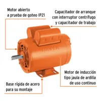Fabricado con un armazón NEMA-56 y protección IP21, está protegido contra el ingreso de partículas sólidas y goteos de agua, brindando mayor seguridad y resistencia en tu taller o espacio de trabajo. Su voltaje dual (115V/230V) ofrece la flexibilidad para conectarlo según la disponibilidad de tu instalación eléctrica.