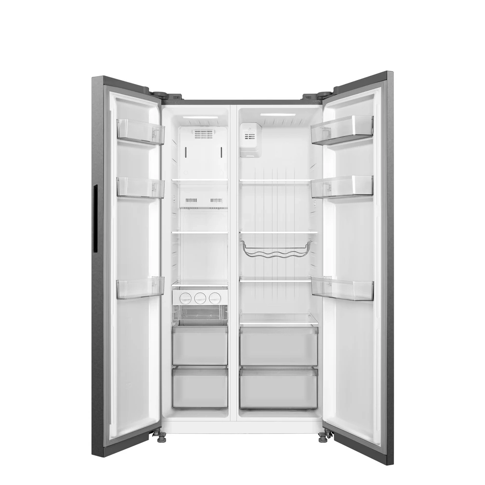 Con sus generosos 555 litros de capacidad, este modelo de nevecon Side by Side ofrece un amplio espacio para todas tus compras. Su interior está inteligentemente diseñado con 3+3 anaqueles tanto en el refrigerador como en el congelador, permitiéndote organizar tus alimentos de manera práctica y eficiente. Además, incluye un elegante rack para botellas de vino y una práctica triple fábrica de hielos Twist.
