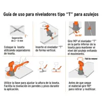| Características | Facilitan la instalación evitando el movimiento del azulejo, ajustando la altura y sosteniendo bordes de manera uniforme. Para losetas de 3 hasta 17 mm de espesor. Para separación de 2 a 6 mm. Cuerpo y llave de polipropileno. Pin tipo “T” de acero. |
