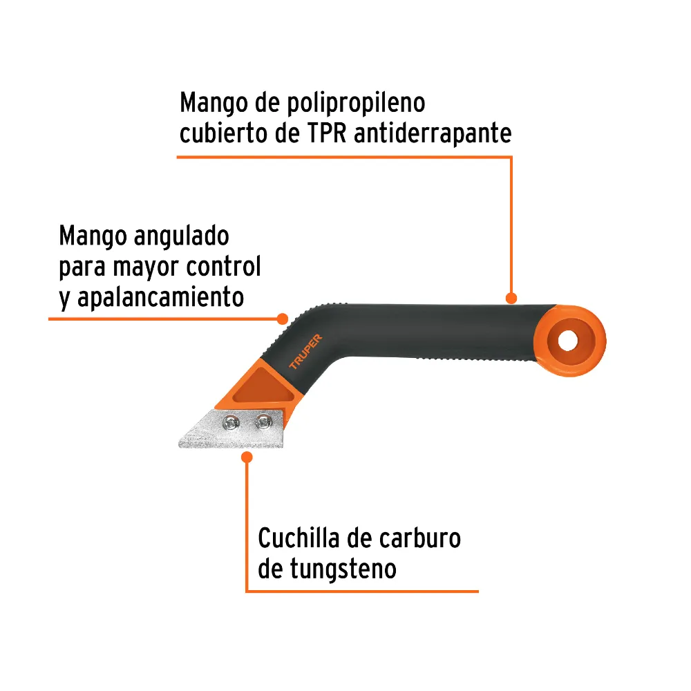 Disfruta de una limpieza precisa y sin daños gracias a sus cuchillas de carburo de tungsteno, un material notablemente resistente al desgaste. El mango angulado, recubierto con material TPR antiderrapante, ofrece un apalancamiento superior y un control total durante el uso, reduciendo la fatiga en tu mano y muñeca. Es la herramienta ideal para mantenimiento en baños, cocinas y cualquier espacio con azulejos.