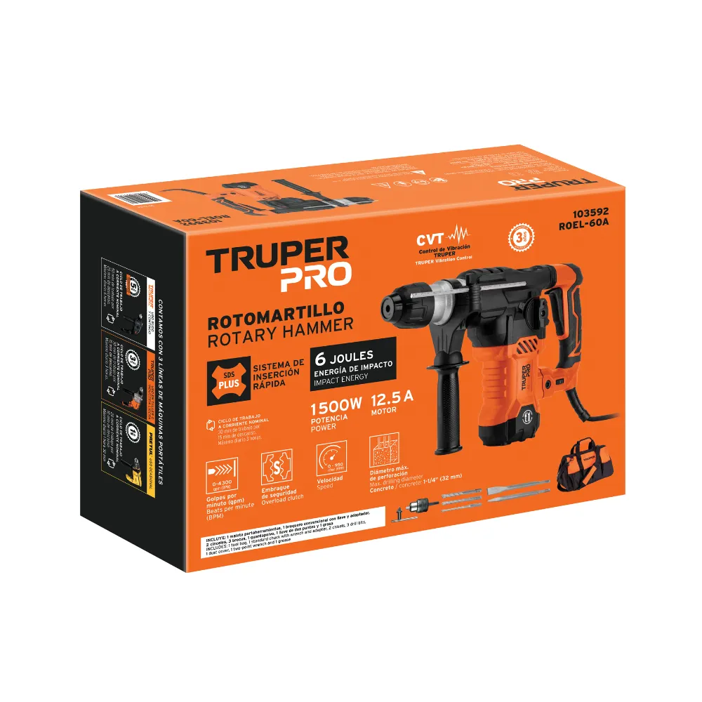 Domina los trabajos de construcción y demolición más demandantes con el rotomartillo Truper. Su motor de 1500W y 6 Joules de energía de impacto perforan concreto, acero y madera con máxima eficiencia, haciendo que cada proyecto sea más rápido y sencillo.