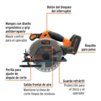 | Características | Doble agarre con diseño ergonómico y grip antiderrapante. Ajuste de ángulo de corte, bisel hasta 50°. Guarda retráctil de aluminio. Zapata para mayor precisión de corte y mayor potencia. Para corte en madera. |