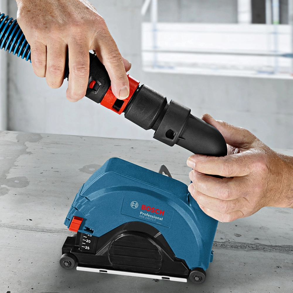 Mantén tu área de trabajo limpia y segura con el sistema de aspiración Bosch GDE 115/125 FC-T, diseñado para esmeriles angulares de 4½” y 5″. Este accesorio profesional captura hasta el 95% del polvo generado durante el corte, protegiendo tu salud y mejorando la visibilidad.