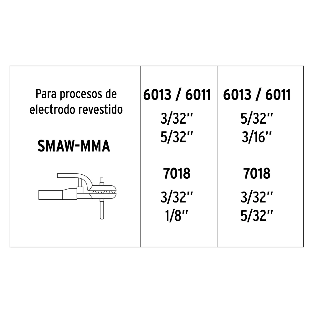 | Características | Ligera, compacta y fácil de transportar, más eficiente (mayor ciclo de trabajo) y con menor consumo eléctrico que una soldadora convencional. Para proceso de soldadura de electrodo revestido (SMAW- MMA) y soldadura de tungsteno (GTAW- TIG). Sistema de adaptación automática BI-VOLTAJE 127-220 V, detecta y se adapta al voltaje de entrada, sin necesidad que el usuario cambie conectores o manipule controles. Rango de corriente: 1 Fase (20 A – 160 A) 2 Fases (20 A – 200 A). Bornes de cambio rápido: 1/2″. |
