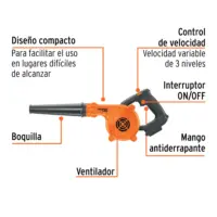 Características Motor libre de carbones (brushless), no requiere mantenimiento y evita el desgaste prematuro. Boquilla que incrementa la velocidad del flujo de aire. 3 Niveles de flujo de aire. Velocidad de aire: 190 – 230 km/h. Ideal para manejo con una sola mano.