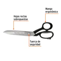 | Características | Hojas rectas sobrepuestas con tuerca de seguridad, templadas y rectificadas para mayor duración de los filos. Acabado niquelado resistente a la corrosión. Mangos ergonómicos con dedales de distintos tamaños para un mejor agarre y un corte más eficiente. Cuchillas con puntas redondeadas para cortes precisos en materiales gruesos. Para uso textil o en pollerías. |
