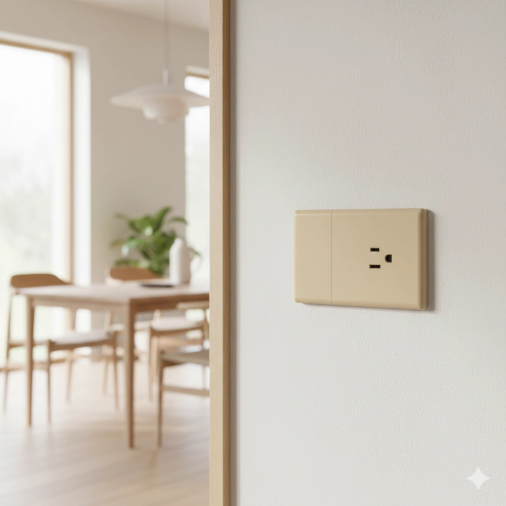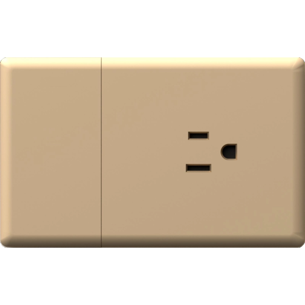 Descubra la combinación perfecta de estilo y seguridad para sus espacios interiores: un interruptor y una toma corriente en acabado oro que aportan elegancia y funcionalidad.